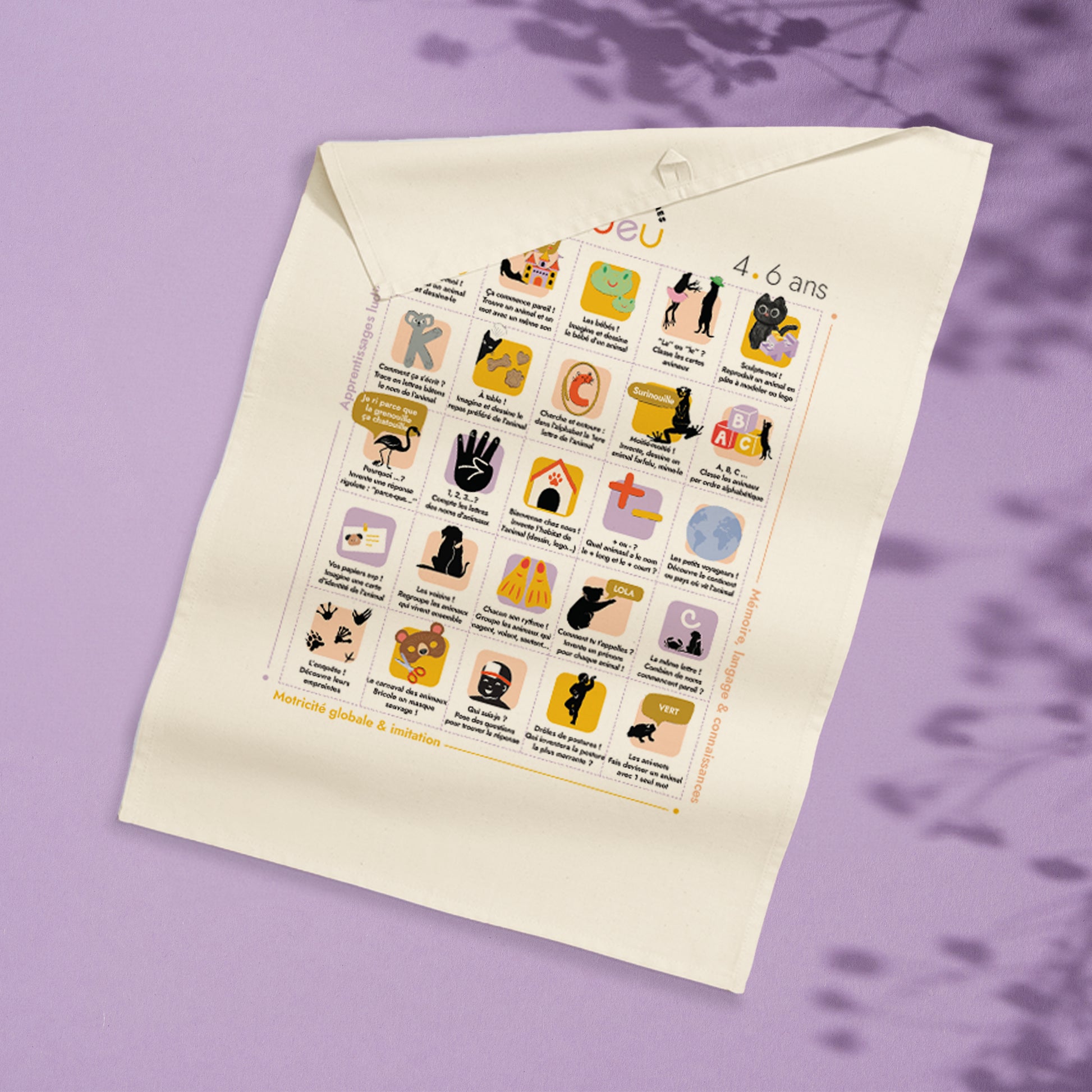 En coton bio lavable, ils illustrent 25 idées d'activités adaptées à l'âge de l'enfant, à mixer, combiner, détourner, réinventer inlassablement !
